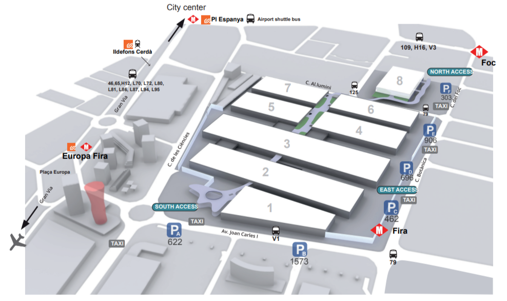 • Metro: L9 Sud (Estaciones “Fira” y “Europa/Fira”) y L10 Sud (Estación “Foc”).